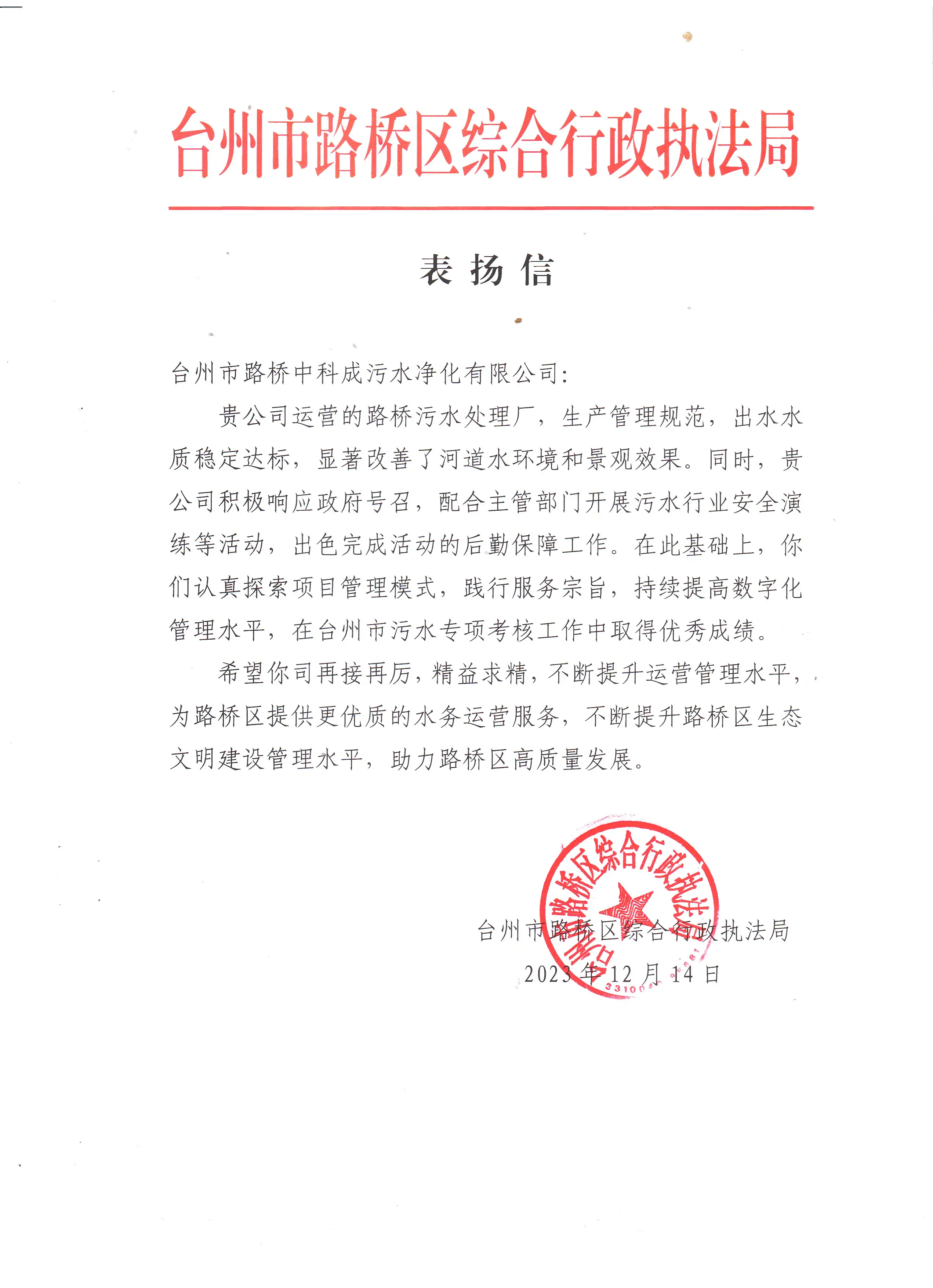 表揚信指出,臺州市路橋中科成路橋污水處理廠,生產管理規范,出水水質穩定達標,顯著改善了河道水環境和景觀效果。同時,公司積極響應政府號召,配合主管部門開展污水行業安全演練等活動,出色完成活動的后勤保障工作。在此基礎上,該廠認真探索項目管理模式,踐行服務宗旨,持續提高數字化管理水平,在臺州市污水專項考核工作中取得優秀成績。