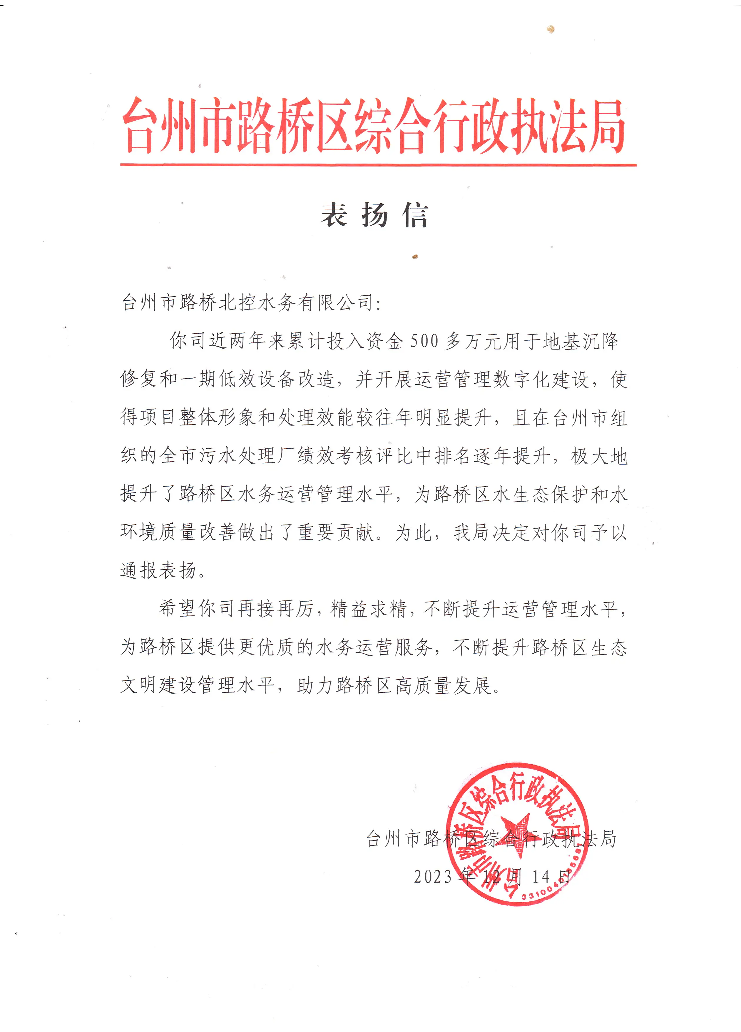 近日,北控水務旗下臺州市路橋中科成污水凈化有限公司、臺州市路橋北控水務有限公司分別收到臺州市路橋區綜合行政執法局發來的表揚信,表揚兩個項目公司污水運營團隊在生產管理、河道水環境改善、安全管理方面提供了高效管理和優質服務,為路橋區生態文明建設做出了重要貢獻。