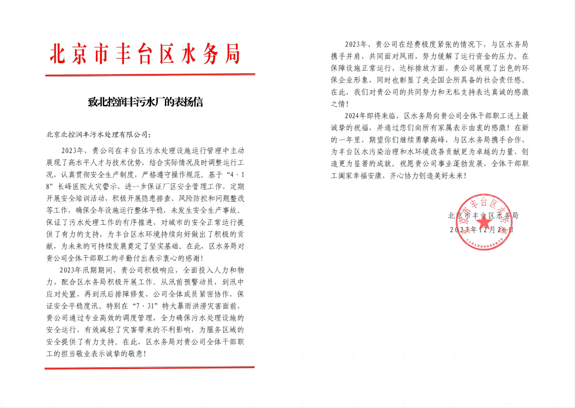 近日,北控水務(wù)旗下日照市北經(jīng)濟開發(fā)區(qū)北控污水處理有限公司、日照北控污水處理有限公司、五蓮北控水務(wù)有限公司分別收到日照市北經(jīng)濟開發(fā)區(qū)管理委員會、五蓮縣住房和城鄉(xiāng)建設(shè)局發(fā)來的表揚信,對三個項目公司的水務(wù)運營管理工作給予充分肯定和表揚。