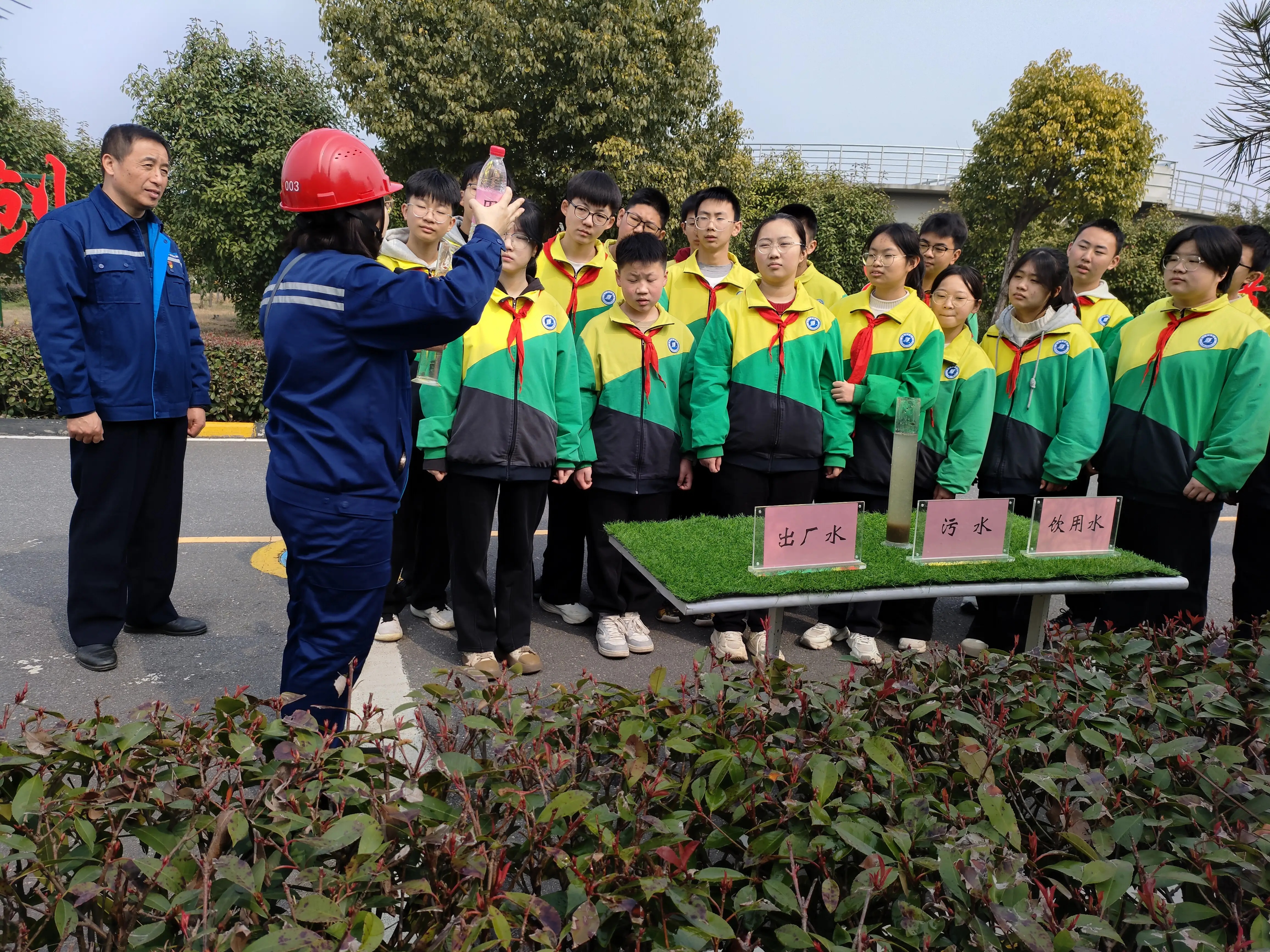 師生們現場參觀了污水處理全流程。從市政管網收集的污水經過格柵攔截垃圾,由水泵提升至曝氣沉砂池去除砂石顆粒,然后在生物池去除有機污染物質,經過二次沉淀、混凝、過濾、消毒等一系列工序,污水得以凈化。工作人員在出水口現場提取水樣,和進廠水、飲用水進行對比,看到污水處理后變清澈的效果后,同學們紛紛驚嘆太神奇了,通過實地參觀,他們對污水處理有了直觀和深入的了解,也更加認識到污水處理工作在環境保護中的重要意義,表示今后要珍惜水資源,節約用水。