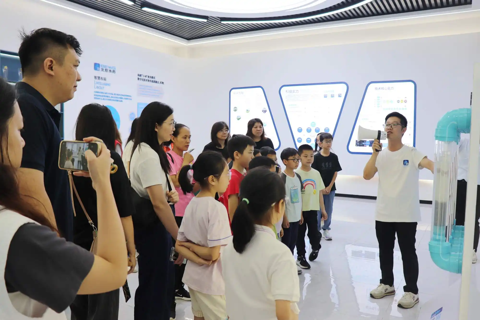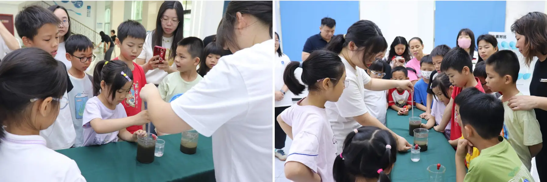 工作人員帶隊觀摩了生活污水氨氮快速測定小實驗,觀察污水在經過不同處理步驟后的水質變化,并實地參觀了污水處理構筑物以及處理全流程。同時,科學凈水實驗環節為孩子們提供了動手實踐的機會,運用花崗巖、石英砂、活性炭等簡單的材料,制作簡易裝置對污水進行凈化處理。