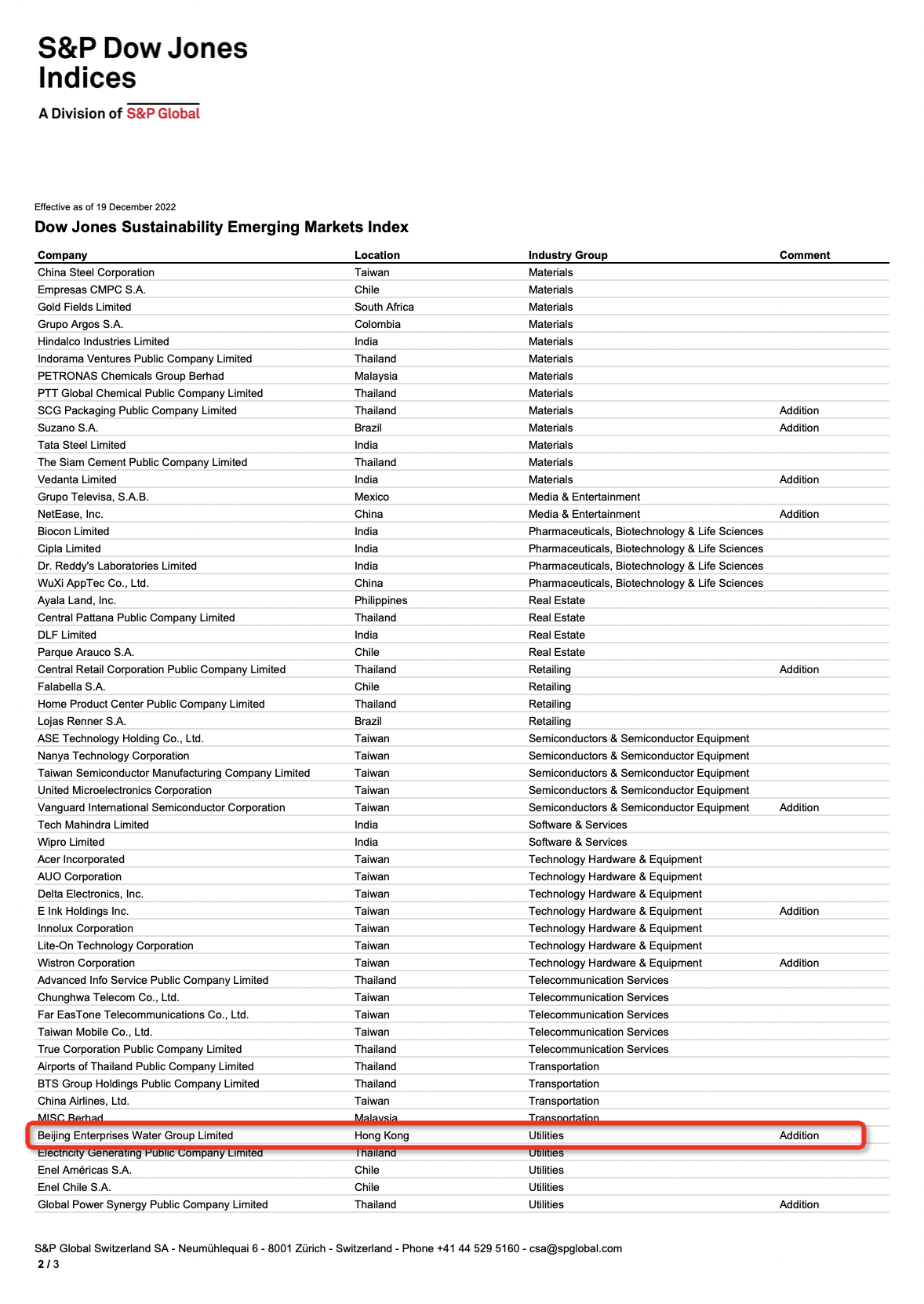 12月10日,標準普爾道瓊斯指數(S&P Dow Jones Indices)公布2022年指數回顧結果,北控水務集團憑借在環境、社會及管治(ESG)方面的出色表現,首次獲納入道瓊斯可持續發展指數(Dow Jones Sustainability Indices),并成為道瓊斯可持續發展指數新興市場(DJSI-Emerging Markets)成分股。本次調整結果將于2022年12月19日正式生效。