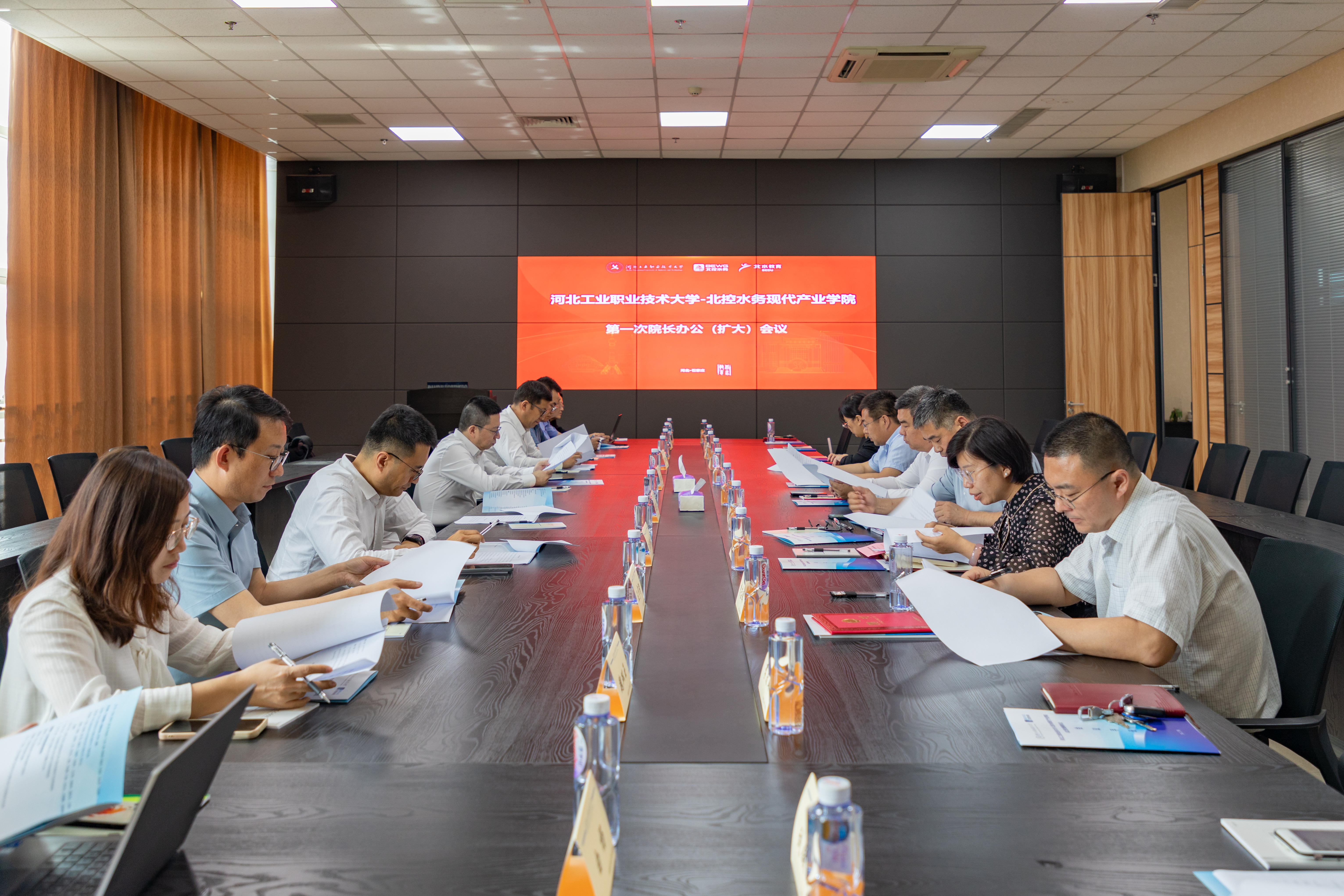 簽約儀式后,產(chǎn)業(yè)學(xué)院召開第一次院長辦公(擴大)會議。會上全體成員集體審議《河北工業(yè)職業(yè)技術(shù)大學(xué)-北控水務(wù)現(xiàn)代產(chǎn)業(yè)學(xué)院章程》并表決通過。隨后,產(chǎn)業(yè)學(xué)院執(zhí)行院長王兵從專業(yè)介紹、工作進展、建設(shè)方案、工作計劃四方面闡述產(chǎn)業(yè)學(xué)院發(fā)展規(guī)劃,與會成員就年度重要工作計劃開展交流研討,并對產(chǎn)業(yè)學(xué)院未來建設(shè)發(fā)展提出建議。