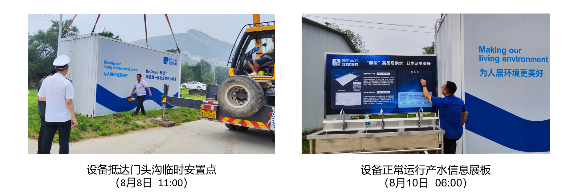 與此同時,北京市政府、安置點管理方以及北控水務集團高效協同、上下聯動,快速推進設備選址和“三通一平”工作。為盡快滿足安置點居民用水需求,北控水務集團緊急調試設備,使之及時投入使用,并制作信息公示展板,方便安置點居民了解設備用途、放心用水。