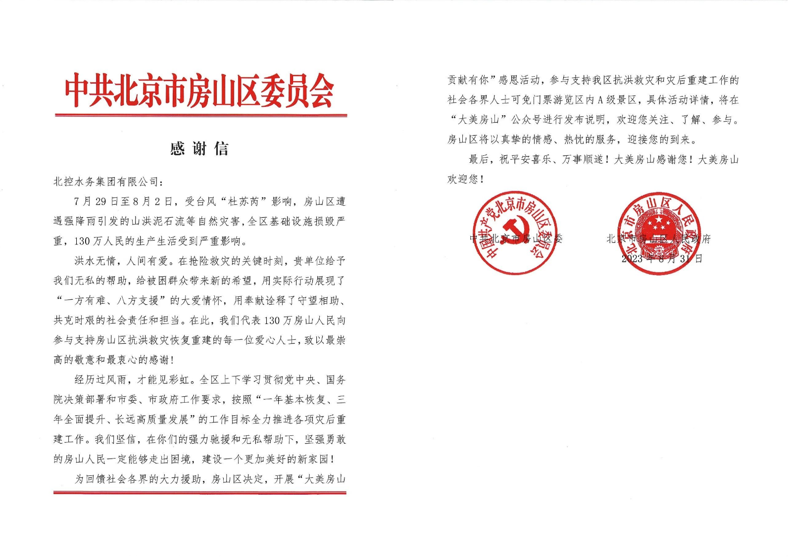 北京市房山區:一封代表130萬人的感謝信