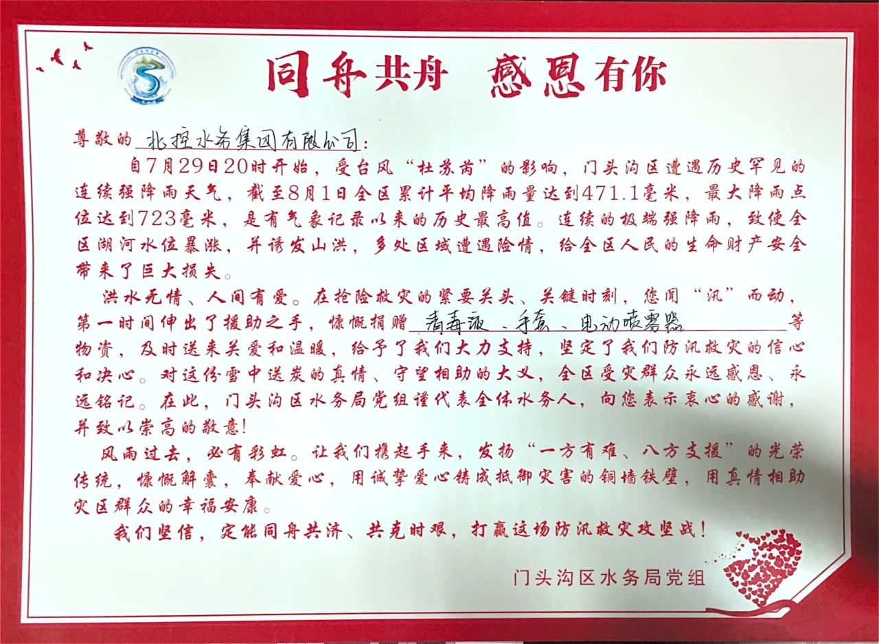 門頭溝區水務局黨組向北控水務集團發來感謝信,信中寫道,在搶險救災的緊要關頭,北控水務集團聞“汛”而動,第一時間伸出援助之手,慷慨捐贈物資,給予大力支持,堅定了門頭溝區防汛救災的信心和決心,全區受災群眾永遠感恩、永遠銘記。