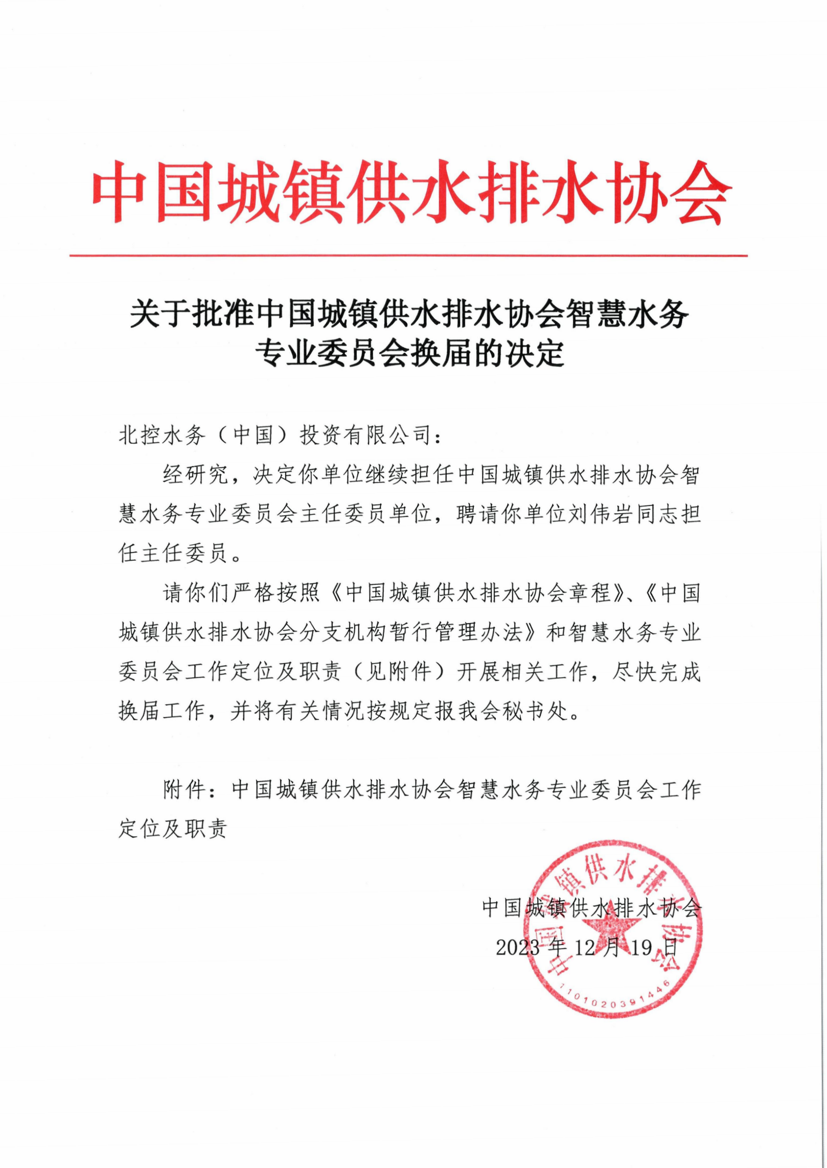 北控水務連任中國城鎮供水排水協會智慧水務專業委員會主任單位 2024-02-28