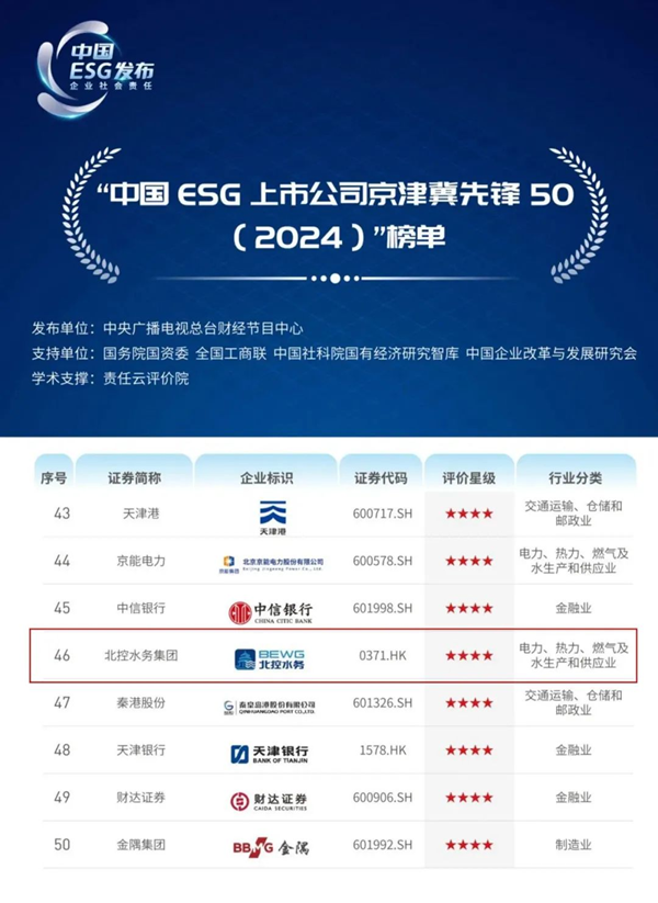 本次會議是京津冀首次聯(lián)合舉辦國有企業(yè)社會責任發(fā)布會,集中發(fā)布了京津冀三地社會責任/ESG藍皮書、國有企業(yè)社會責任/ESG報告。北控水務獲評“北京市屬國有控股上市公司ESG十佳案例”,入選“中國ESG上市公司京津冀先鋒50(2024)”,展現(xiàn)了集團積極響應ESG政策指引、高標準踐行ESG的顯著成效。
