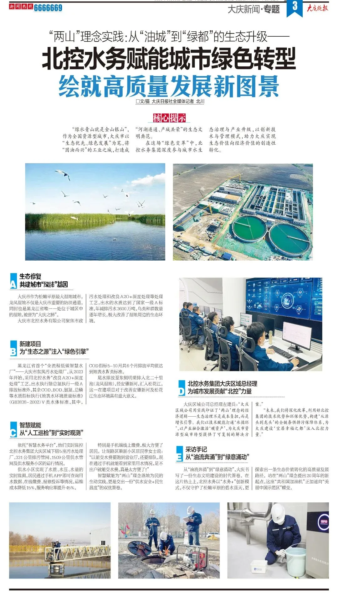 近日,大慶晚報報道北控水務集團踐行“兩山”理念,助力大慶市推進生態轉型,通過污水處理、濕地保護、智慧水務等措施,實現從“油城”到“綠都”的升級,打造生態文明典范。